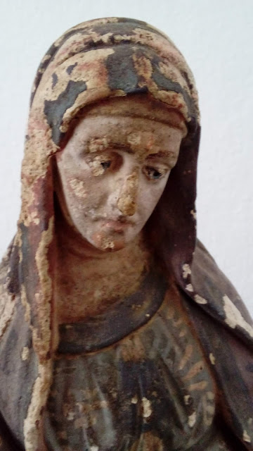 Bem, e o que fazer com esta linda imagem de Santana Mestra? Neste caso de desgaste em que ela se encontra, só uma restauração que respeite a escultura e o estofamento que tem detalhes em ouro. Ou, então, e foi o que eu fiz - não nado em ouro - fiz uma boa higienização com pincel e dei três camadas de cera incolor. A cera além de conter o esfarelamento deu uma pátina protetora e de brilho bem discreto e dei um pequeno e cuidadoso lustre para finalizar o meu restauro/resgate/de imagem prestes a ir para o lixo/ou daquela que, se caísse em mãos inescrupulosas, seria toda repintada, toda macacada, desfigurada.